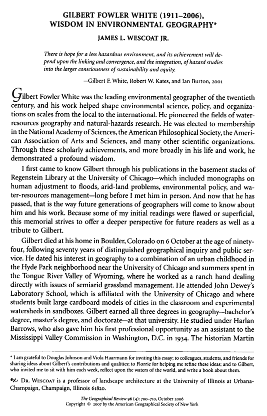 Wescoat Jr, J. L. (2006). Gilbert Fowler White (1911-2006): Wisdom in Environmental Geography. Geographical Review, 96(4), 700–710. https://doi.org/10.1111/j.1931-0846.2006.tb00524.x.