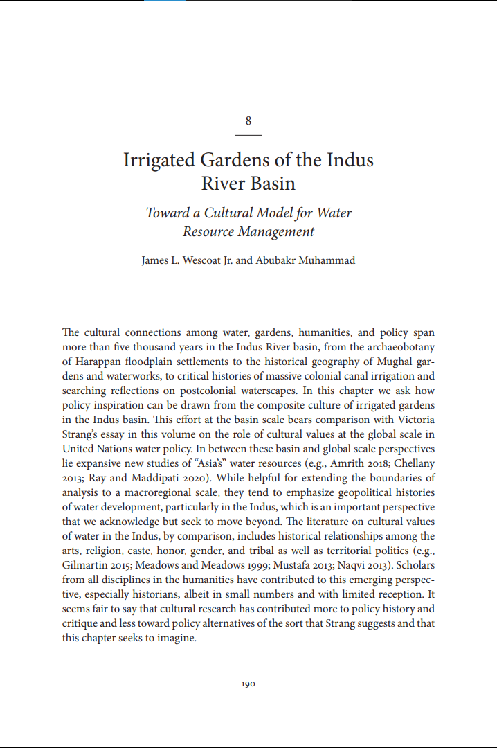Wescoat Jr, J. L., & Muhammad, A. (2021). Irrigated Gardens of the Indus River Basin: Toward a Cultural Model for Water Resource Management. In K. De Wolff, R. C. Faletti, & López-Calvo. (Eds.), Hydrohumanities : Water Discourse and Environmental Futures (pp. 190–214). Berkeley: University of California Press.