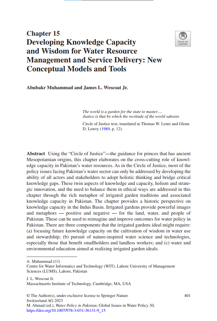 Muhammad, A., & Wescoat Jr, J. L. (2023). Developing Knowledge Capacity and Wisdom for Water Resource Management and Service Delivery: New Conceptual Models and Tools. In M. Ahmad (Ed.), Water Policy in Pakistan: Issues and Options (pp. 401–432). Cham: Springer.