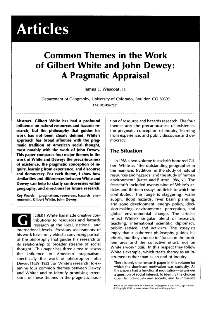 Wescoat Jr, J. L. (1992). Common Themes in the Work of Gilbert White and John Dewey: A Pragmatic Appraisal. Annals of the Association of American Geographers, 82(4), 587–607. https://doi.org/10.1111/j.1467-8306.1992.tb01719.x