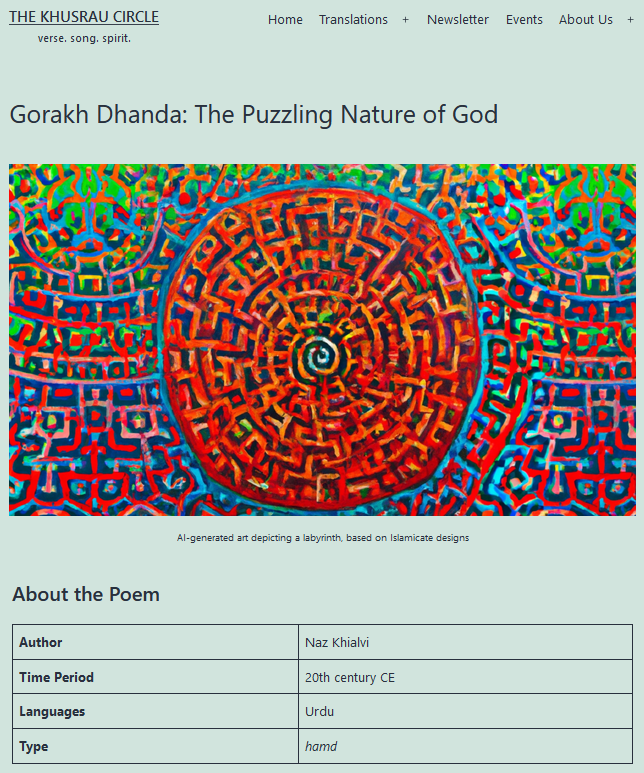 This online resource is an extensive introduction to the topics in the poem "Tum ik Gorakh Dhanda ho" followed by two renditions available on YouTube - one by the famous Ustad Nusrat Fateh Ali Khan in Qawwali style, and the other by Naz Khialvi himself in teht-ul-lafz. An extensive translation in Hindi and English is provided, alongwith the transcript and transliteration in Urdu. Given that Qawwali style involves improvisational mixing of verses from other poems and poets, the authors of translation have also identified the external verses and their sources, that have been improvised in by the Ustad.